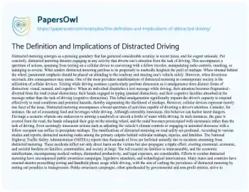 This essay is about the definition and implications of distracted driving. It explains that distracted driving includes any activity that diverts attention from driving, such as texting, eating, or adjusting controls. The essay highlights the dangers of distracted driving, noting its significant contribution to accidents, injuries, and fatalities. It discusses efforts to combat the issue through public awareness campaigns, legislation, and technological innovations. Despite these efforts, distracted driving remains a persistent problem. The essay emphasizes the need for education, consistent enforcement of laws, technological advancements, and a cultural shift to prioritize road safety and reduce distractions.