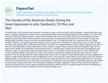 The Demise of the American Dream During the Great Depression in John Steinbeck's 'Of Mice and Men'. (2023, Feb 03). Retrieved from https://hub.papersowl.com/examples/the-demise-of-the-american-dream-during-the-great-depression-in-john-steinbecks-of-mice-and-men/