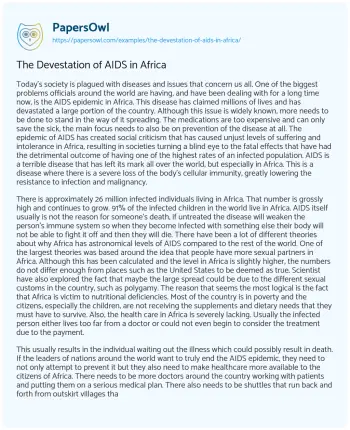 The Devestation of AIDS in Africa. (2019, Feb 12). Retrieved from https://hub.papersowl.com/examples/the-devestation-of-aids-in-africa/