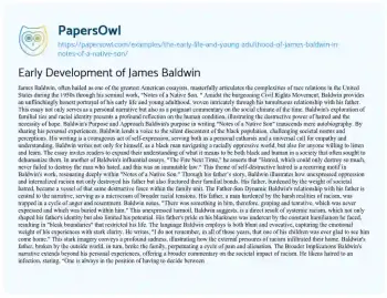 Early Development of James Baldwin. (2022, Jun 26). Retrieved from https://hub.papersowl.com/examples/the-early-life-and-young-adulthood-of-james-baldwin-in-notes-of-a-native-son/