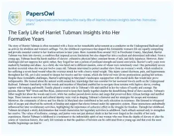 Order now From a young age, Tubman faced the harsh realities of slavery: exhaustive physical labor, constant threats of sale, and daily injustices. However, these challenges did not suppress her spirit; rather, they forged her into a person of profound strength and moral conviction.