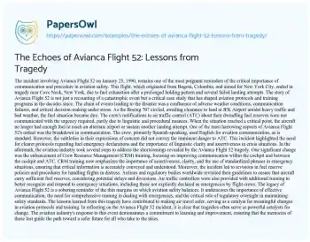 This essay about Avianca Flight 52 discusses the tragic incident of January 25, 1990, when the flight ran out of fuel and crashed due to a combination of adverse weather, communication failures, and procedural shortcomings. It highlights the critical importance of communication and procedure in aviation safety, examining how the disaster led to significant changes in the industry. The essay outlines the improvements in Crew Resource Management (CRM) training, which now emphasizes the importance of assertiveness and clarity in emergency communications. Additionally, it mentions revisions in fuel reserve policies and air traffic control training to better recognize and respond to flights in distress. The legacy of Avianca Flight 52, as discussed, serves as a reminder and a catalyst for ongoing enhancements in aviation protocols and safety standards, ensuring such a tragedy serves as a foundation for safer future air travel. More free essay examples are accessible at PapersOwl about Tragedy.
