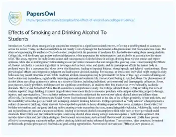 This essay will examine the impact of alcohol consumption on college students. It will discuss its effects on academics, health, and social behavior. You can also find more related free essay samples at PapersOwl about Addiction.