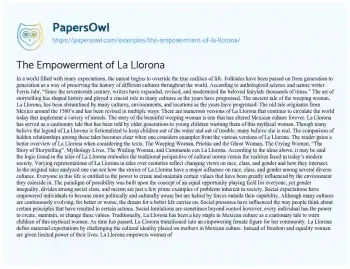 This essay will discuss the evolution of the La Llorona legend from a tale of warning to a symbol of empowerment. It will explore how contemporary interpretations have shifted the narrative to reflect themes of resistance, strength, and cultural identity, particularly in Latin American communities. Also at PapersOwl you can find more free essay examples related to Critical Theory.