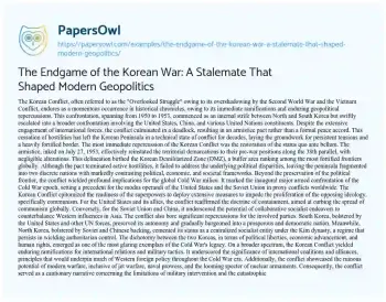 The Endgame of the Korean War: A Stalemate That Shaped Modern Geopolitics. (2024, Mar 25). Retrieved from https://hub.papersowl.com/examples/the-endgame-of-the-korean-war-a-stalemate-that-shaped-modern-geopolitics/