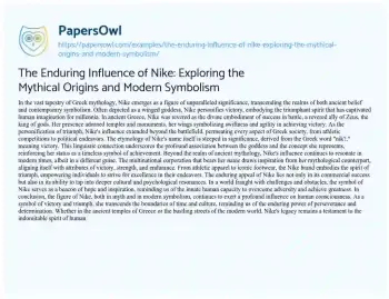 The Enduring Influence of Nike: Exploring the Mythical Origins and Modern Symbolism. (2024, May 21). Retrieved from https://hub.papersowl.com/examples/the-enduring-influence-of-nike-exploring-the-mythical-origins-and-modern-symbolism/