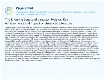 The Enduring Legacy of Langston Hughes: Key Achievements and Impact on American Literature. (2024, May 21). Retrieved from https://hub.papersowl.com/examples/the-enduring-legacy-of-langston-hughes-key-achievements-and-impact-on-american-literature/