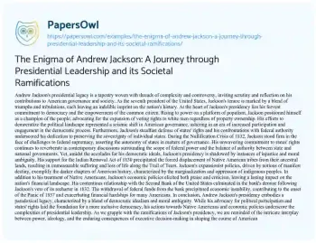 The Enigma of Andrew Jackson: A Journey through Presidential Leadership and its Societal Ramifications. (2024, May 28). Retrieved from https://hub.papersowl.com/examples/the-enigma-of-andrew-jackson-a-journey-through-presidential-leadership-and-its-societal-ramifications/