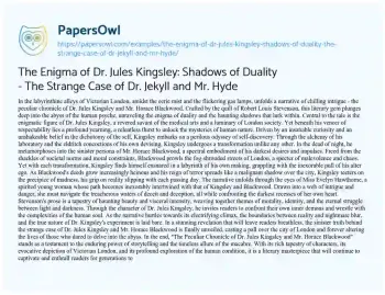 The Enigma of Dr. Jules Kingsley: Shadows of Duality - The Strange Case of Dr. Jekyll and Mr. Hyde. (2024, Mar 25). Retrieved from https://hub.papersowl.com/examples/the-enigma-of-dr-jules-kingsley-shadows-of-duality-the-strange-case-of-dr-jekyll-and-mr-hyde/