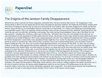 The Enigma of the Jamison Family Disappearance. (2023, Oct 26). Retrieved from https://hub.papersowl.com/examples/the-enigma-of-the-jamison-family-disappearance/