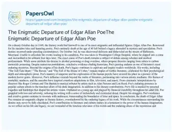 The Enigmatic Departure of Edgar Allan PoeThe Enigmatic Departure of Edgar Allan Poe. (2024, Jun 17). Retrieved from https://hub.papersowl.com/examples/the-enigmatic-departure-of-edgar-allan-poethe-enigmatic-departure-of-edgar-allan-poe/