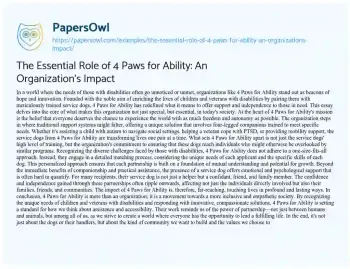This essay about 4 Paws for Ability explores the organization’s pivotal role in enhancing the lives of individuals with disabilities through the provision of specially trained service dogs. It highlights the organization’s unique approach to matching service dogs with children and veterans, focusing on the individual needs of each applicant to ensure a successful partnership. The essay underscores the multifaceted benefits of these partnerships, including practical assistance, emotional support, and the promotion of independence. Moreover, it reflects on the broader societal impact of 4 Paws for Ability, emphasizing its contribution to fostering a more inclusive and empathetic community. By showcasing the organization’s dedication to personalized matches between service dogs and recipients, the essay portrays 4 Paws for Ability as a model of compassion and innovation in addressing the challenges faced by people with disabilities. Moreover, at PapersOwl, there are additional free essay samples connected to Organization.