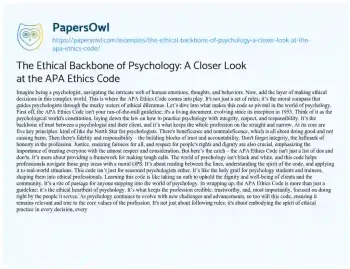 This lively essay delves into the essence and significance of the APA Ethics Code in the field of psychology. Portraying the code not just as a set of rules but as the moral compass of the profession, it explains how this dynamic document guides psychologists through ethical dilemmas. The essay illuminates the evolution of the code since 1953, emphasizing its role as the backbone of trust and integrity in psychologist-client relationships. It breaks down the code’s five key principles – beneficence and nonmaleficence, fidelity and responsibility, integrity, justice, and respect for people’s rights and dignity – each serving as a guiding star for ethical practice. The piece further explores how the code functions more as a framework for decision-making rather than a strict set of directives, highlighting its importance in navigating the complex, often gray areas of psychological practice. Additionally, the essay underscores the code’s significance in shaping the ethical foundations of psychology students and trainees. Concluding on a reflective note, it portrays the APA Ethics Code as the ethical heartbeat of psychology, a document that evolves with the field, ensuring the profession remains credible and true to its core values. On PapersOwl, there’s also a selection of free essay templates associated with Ethics