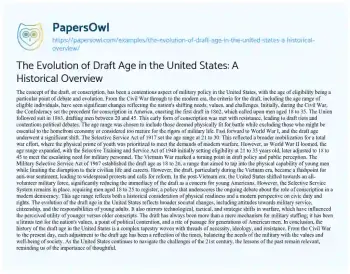 This essay about the evolution of draft age in the United States offers a comprehensive overview of how conscription criteria, particularly age eligibility, have changed from the Civil War to the present. It outlines the initial draft age ranges established during the Civil War and tracks the adjustments made through major conflicts such as World Wars I and II, and the Vietnam War. The essay highlights the significant shift in draft age during World War I to prioritize youth and physical fitness, and further expansions and adjustments in response to the demands of subsequent conflicts. It also discusses the post-Vietnam era transition to an all-volunteer military force, while maintaining registration requirements for young men. Through these historical changes, the essay explores the broader implications of draft age on society, military needs, and individual rights, concluding with reflections on the role of conscription in modern America. You can also find more related free essay samples at PapersOwl about United States.