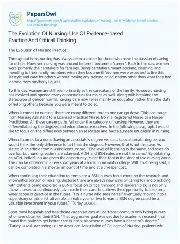 The Evolution Of Nursing: Use Of Evidence-based Practice And Critical Thinking. (2022, Aug 17). Retrieved from https://hub.papersowl.com/examples/the-evolution-of-nursing-use-of-evidence-based-practice-and-critical-thinking/