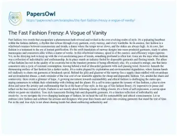 This essay is about the phenomenon of fast fashion, exploring its allure, controversies, and the growing movement towards sustainability within the industry. It delves into the rapid pace of trends and consumption, highlighting the environmental and ethical concerns associated with mass production. Despite the seductive appeal of fast fashion, the essay emphasizes the importance of rethinking our relationship with clothing and embracing slow fashion as a means of promoting authenticity and craftsmanship.