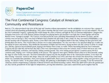 The First Continental Congress: Catalyst of American Community and Resistance. (2024, Mar 01). Retrieved from https://hub.papersowl.com/examples/the-first-continental-congress-catalyst-of-american-community-and-resistance/