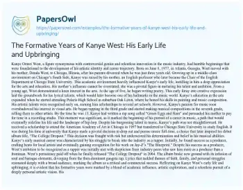 The Formative Years of Kanye West: His Early Life and Upbringing. (2024, May 21). Retrieved from https://hub.papersowl.com/examples/the-formative-years-of-kanye-west-his-early-life-and-upbringing/