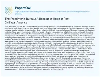 The Freedmen's Bureau: A Beacon of Hope in Post-Civil War America. (2024, Apr 01). Retrieved from https://hub.papersowl.com/examples/the-freedmens-bureau-a-beacon-of-hope-in-post-civil-war-america/