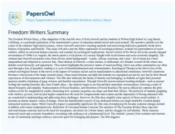The Freedom Writers Diary, a film adaptation of the real-life story of Erin Gruwell and her students at Wilson High School in Long Beach, California, is a profound exploration of the transformative power of education amidst social and racial turmoil. The narrative unfolds over the course of the students' high school journey, where Gruwell's innovative teaching methods and unwavering dedication gradually break down barriers of prejudice and hostility. This essay will delve into the film's exploration of sociological themes, evaluate its representation of social realities, reflect on universal human concerns, and consider its sociological implications.