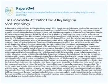 Order now Their scholarly endeavors showcased humanity's inclination to attribute the actions of others predominantly to their inherent predispositions, sidestepping the situational milieus that conceivably shaped said actions. For instance, if someone exhibits discourteous conduct while driving, our instinctive reaction may incline towards deeming them inherently impolite or reckless, rather than contemplating external circumstances such as an exigent situation necessitating haste.
