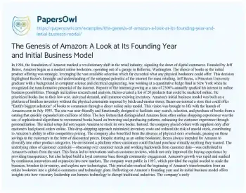The Genesis of Amazon: A Look at Its Founding Year and Initial Business Model. (2024, May 12). Retrieved from https://hub.papersowl.com/examples/the-genesis-of-amazon-a-look-at-its-founding-year-and-initial-business-model/