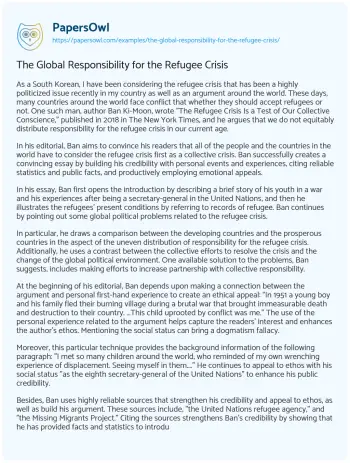 In his editorial, Ban aims to convince his readers that all of the people and the countries in the world have to consider the refugee crisis first as a collective crisis. Ban successfully creates a convincing essay by building his credibility with personal events and experiences, citing reliable statistics and public facts, and productively employing emotional appeals.