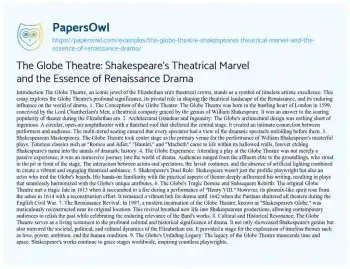 The Globe Theatre: Shakespeare's Theatrical Marvel and the Essence of Renaissance Drama. (2023, Dec 01). Retrieved from https://hub.papersowl.com/examples/the-globe-theatre-shakespeares-theatrical-marvel-and-the-essence-of-renaissance-drama/