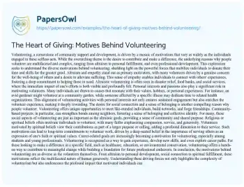 The Heart of Giving: Motives Behind Volunteering. (2024, Mar 02). Retrieved from https://hub.papersowl.com/examples/the-heart-of-giving-motives-behind-volunteering/
