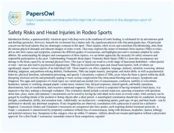 Exploring the perilous nature of rodeo sports, this essay emphasizes the high incidence of concussions among participants. It will discuss the physical demands and risks inherent in rodeo, the medical implications of concussions, and the measures taken to mitigate these risks. The piece aims to raise awareness about the need for enhanced safety protocols and medical readiness in this high-adrenaline sport. You can also find more related free essay samples at PapersOwl about Concussion.
