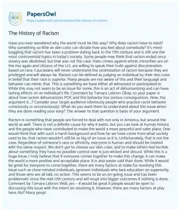 The History of Racism. (2019, Apr 01). Retrieved from https://hub.papersowl.com/examples/the-history-of-racism/