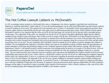 This essay about the landmark case Liebeck vs. McDonald’s explores the incident where Stella Liebeck suffered severe burns from spilled coffee leading to a legal battle that questioned consumer rights and corporate responsibility. The case often misrepresented as frivolous highlighted product liability issues and prompted changes in how companies address safety and customer warnings. It remains a significant example of the legal system’s role in balancing personal responsibility and corporate duty of care.