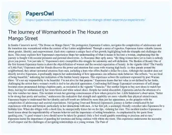 The Journey of Womanhood in The House on Mango Street. (2019, Jan 08). Retrieved from https://hub.papersowl.com/examples/the-house-on-mango-street-esperanza-experiences/