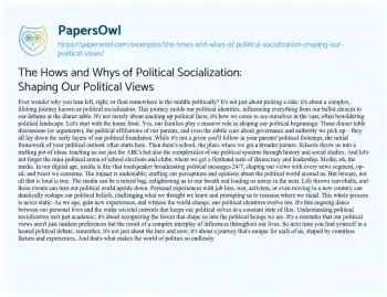 The Hows and Whys of Political Socialization: Shaping Our Political Views. (2024, Apr 01). Retrieved from https://hub.papersowl.com/examples/the-hows-and-whys-of-political-socialization-shaping-our-political-views/