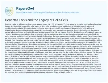 Henrietta Lacks and the Legacy of HeLa Cells. (2020, Dec 15). Retrieved from https://hub.papersowl.com/examples/the-immortal-life-of-henrietta-lacks-2/