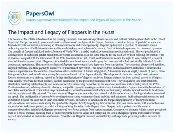 This essay is about the flappers of the 1920s, young women who defied traditional norms and embraced a lifestyle of independence and modernity. It discusses how flappers emerged in a post-World War I society, influenced by changes in gender roles and the empowerment of women. The essay highlights their distinctive fashion, including short skirts, bobbed hair, and bold makeup, as well as their rebellious behavior, such as frequenting jazz clubs and speakeasies. Despite facing criticism, flappers played a significant role in challenging societal norms and paving the way for future feminist movements, leaving a lasting impact on fashion, behavior, and gender roles.