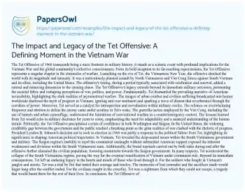 The Impact and Legacy of the Tet Offensive: A Defining Moment in the Vietnam War. (2024, Jun 17). Retrieved from https://hub.papersowl.com/examples/the-impact-and-legacy-of-the-tet-offensive-a-defining-moment-in-the-vietnam-war/