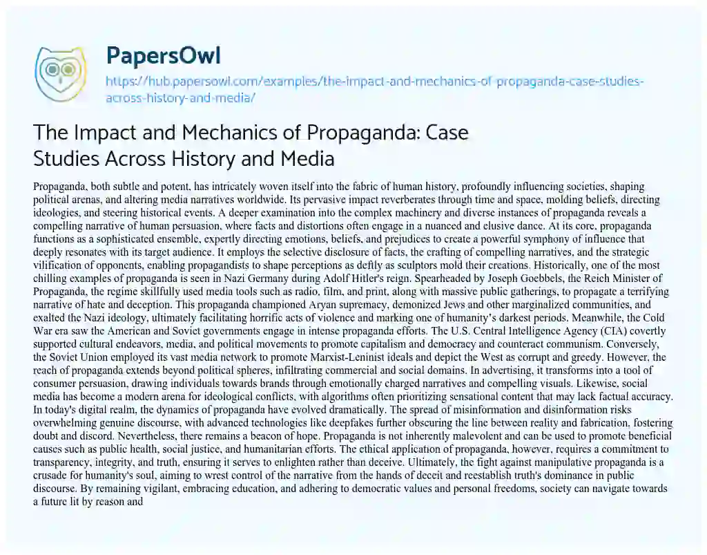 The Impact and Mechanics of Propaganda: Case Studies Across History and Media. (2024, May 12). Retrieved from https://hub.papersowl.com/examples/the-impact-and-mechanics-of-propaganda-case-studies-across-history-and-media/