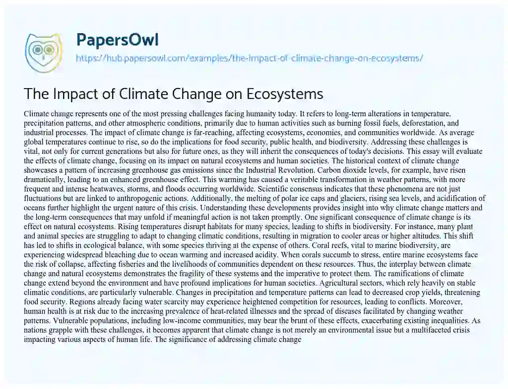 The Impact of Climate Change on Ecosystems. (2026, Mar 28). Retrieved from https://hub.papersowl.com/examples/the-impact-of-climate-change-on-ecosystems/