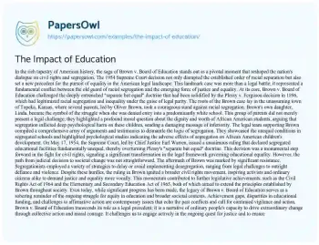 This essay about Brown v. Board of Education discusses its significant impact on American civil rights and education. It outlines the case’s challenge to the “separate but equal” doctrine, leading to the Supreme Court’s 1954 decision to declare segregated educational facilities inherently unequal. The essay also reflects on the ongoing struggles and the broader civil rights movements inspired by this landmark case, highlighting the importance of continued advocacy for justice and equality in American society.
