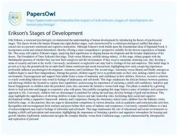 This essay is about Erik Erikson’s stages of development, a theory that outlines eight distinct stages from infancy to late adulthood. Each stage presents a unique psychological conflict that must be resolved for healthy development. The stages include Trust vs. Mistrust, Autonomy vs. Shame and Doubt, Initiative vs. Guilt, Industry vs. Inferiority, Identity vs. Role Confusion, Intimacy vs. Isolation, Generativity vs. Stagnation, and Integrity vs. Despair. The essay explains how successfully navigating these stages leads to positive outcomes, while failure results in negative consequences. Erikson’s theory emphasizes the continuous nature of development influenced by both internal and external factors.