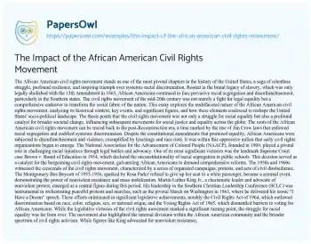 This essay explores the multifaceted nature of the African American civil rights movement, analyzing its historical context, key events, and significant figures, and how these elements coalesced to reshape the United States' socio-political landscape. The thesis posits that the civil rights movement was not only a struggle for racial equality but also a profound catalyst for broader societal change, influencing subsequent movements for social justice and equality across the globe.