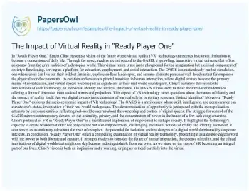 This essay about the portrayal of virtual reality (VR) technology in “Ready Player One” explores the novel’s depiction of the OASIS, a vast and immersive virtual universe. It examines the implications of such technology on identity, societal structures, and socio-economic factors. The OASIS is presented as a space for liberation and exploration, challenging traditional notions of reality and identity while also highlighting the potential dangers of escapism and corporate control over digital worlds. Through the narrative, the essay discusses how VR technology could reshape human interaction, offering opportunities for empowerment but also posing risks of isolation and monopolization. It serves as a reflection on the potential futures of VR, emphasizing its capacity to alter society and the importance of navigating its development with caution. PapersOwl showcases more free essays that are examples of Ready Player One.