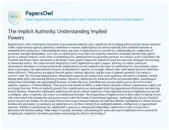 This essay about implied powers, explaining how they function within a legal or governmental framework. It explores the concept of implied powers, defining them as those not explicitly stated in a constitution or law but derived from those that are. The essay discusses examples of implied powers, such as those granted to the branches of government in the United States Constitution, illustrating how they play a crucial role in governance. Additionally, it examines the implications and controversies surrounding implied powers, highlighting their significance in shaping governmental authority and policy-making. Ultimately, the essay sheds light on the nuanced dynamics of implied powers and their impact on legal and political systems. Additionally, PapersOwl presents more free essays samples linked to Understanding.