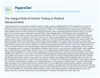The Integral Role of Animal Testing in Medical Advancements. (2020, Jan 06). Retrieved from https://hub.papersowl.com/examples/the-importance-of-animal-models-in-vaccines/
