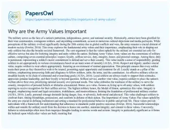 This essay will discuss the significance of the Army values: loyalty, duty, respect, selfless service, honor, integrity, and personal courage. It will explore how these values form the ethical framework for Army personnel, guiding their behavior and decisions both in and out of service. The piece will also consider the role of these values in military culture, their impact on unit cohesion and mission success, and their relevance in broader societal contexts. PapersOwl showcases more free essays that are examples of Army.