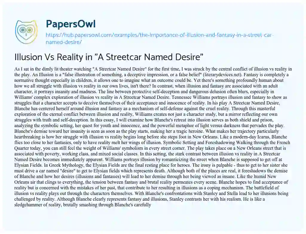 This essay will discuss the role of illusion and fantasy in Tennessee Williams’ “A Streetcar Named Desire.” It will explore how the characters use illusion to cope with reality and how these illusions contribute to the play’s tragic elements. Additionally, PapersOwl presents more free essays samples linked to A Streetcar Named Desire.