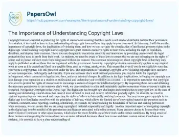 Copyright laws are essential in protecting the rights of creators and ensuring that their work is not used or distributed without their permission. As a student, it is crucial to have a clear understanding of copyright laws and how they apply to your own work. In this essay, I will discuss the importance of copyright laws, the implications of violating them, and how we can navigate the complexities of intellectual property rights in the digital age.