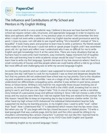 The Influence and Contributions of My School and Mentors in My English Writing. (2022, Jun 27). Retrieved from https://hub.papersowl.com/examples/the-influence-and-contributions-of-my-school-and-mentors-in-my-english-writing/