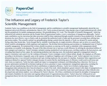 The Influence and Legacy of Frederick Taylor's Scientific Management. (2024, Jun 28). Retrieved from https://hub.papersowl.com/examples/the-influence-and-legacy-of-frederick-taylors-scientific-management/
